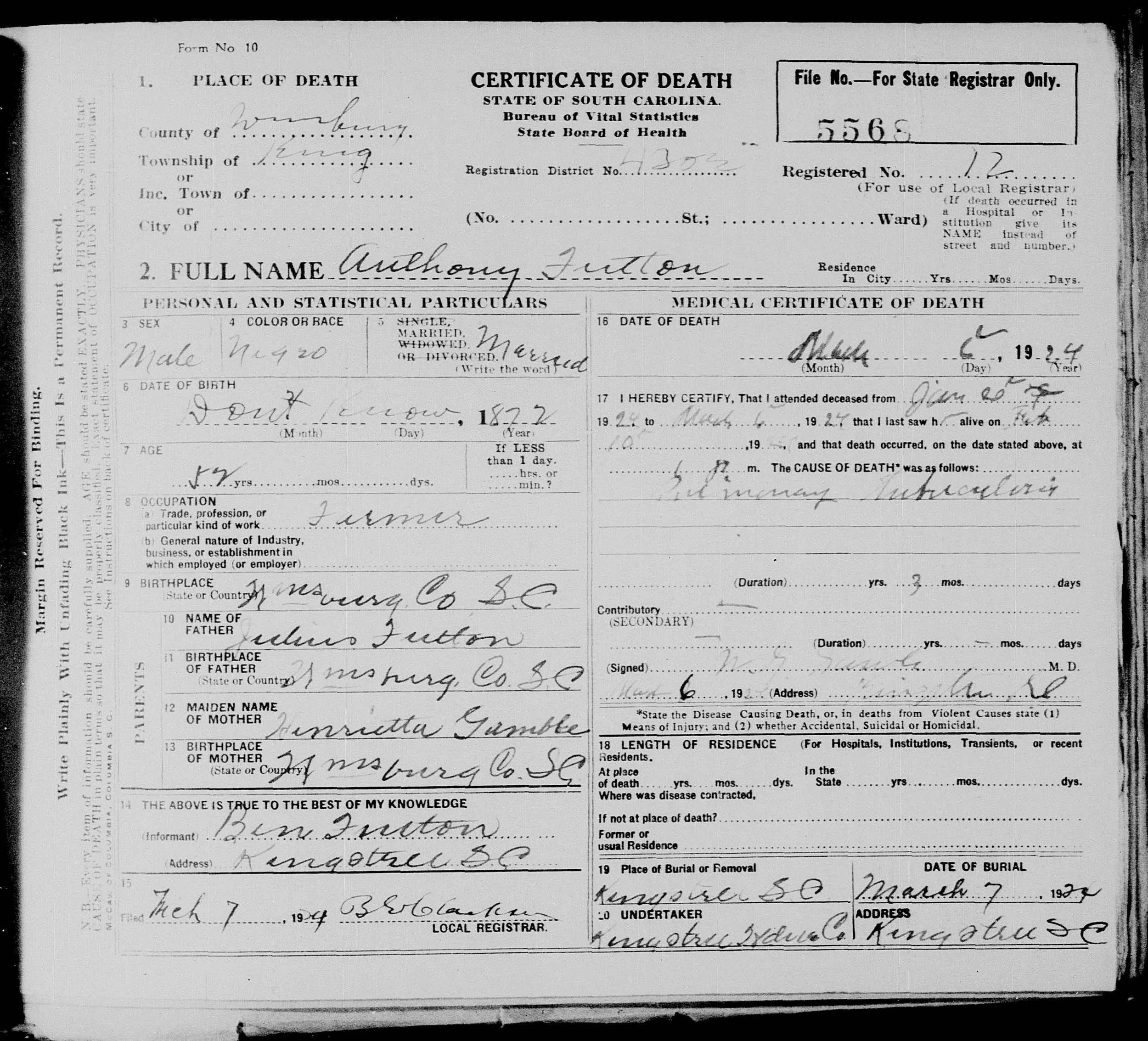 Anthony Fulton (1874-1924) Death Certificate, 1924.